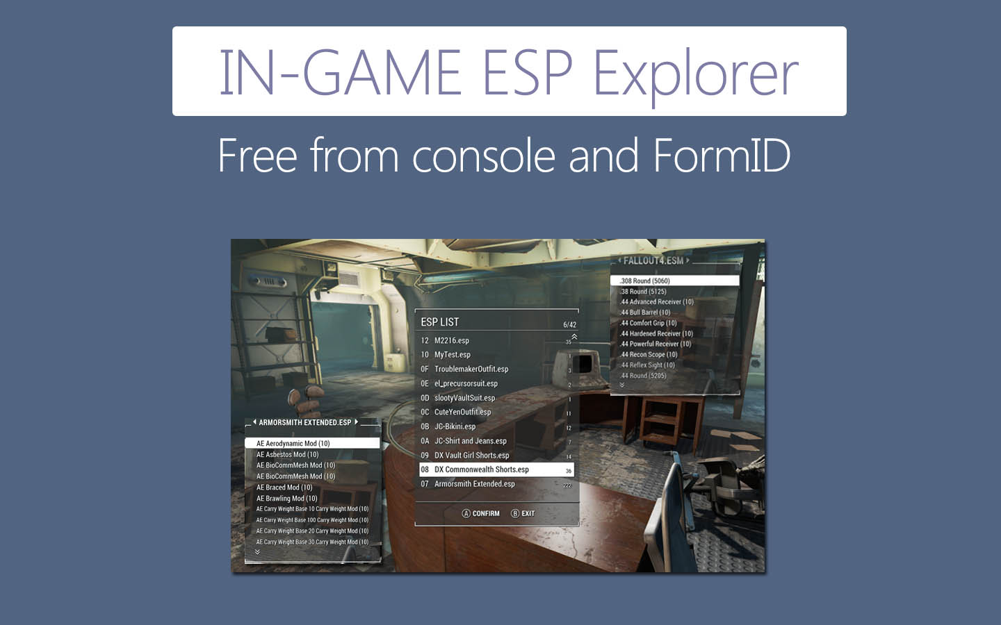 - В Fallout 4 добавится возможность вызова списка всех установленных модов прямо в игре (вызов клавишей F11 по умолчанию или модифицированное сочетание клавиш Shift + Z). Для клавиатуры AZERTY установите в файле ESPExplorer.ini в строчке AZERTY = 1, это изменит опциональный вызов списка модов с помощью горячих клавиш Shift + Z на Shift + W.