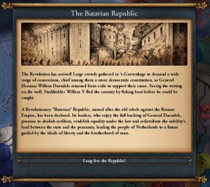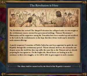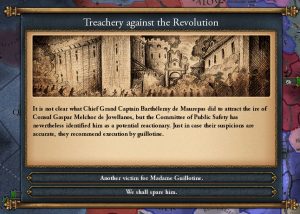 Являясь революционным государством, но не будучи целью, вы не сможете стать империей или диктатурой. Вместо этого, при низких республиканских традициях есть шанс, что страна возьмёт под контроль Комитет общественного спасения, чтобы защитить принципы революции.