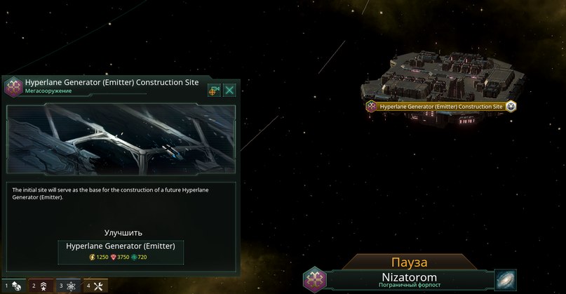 После того, как вы исследовали Hyperlane Generation, вам нужно построить мегаструктуры. Они могут быть построены только в пределах границ вашей Империи, и в них может быть только один из них.