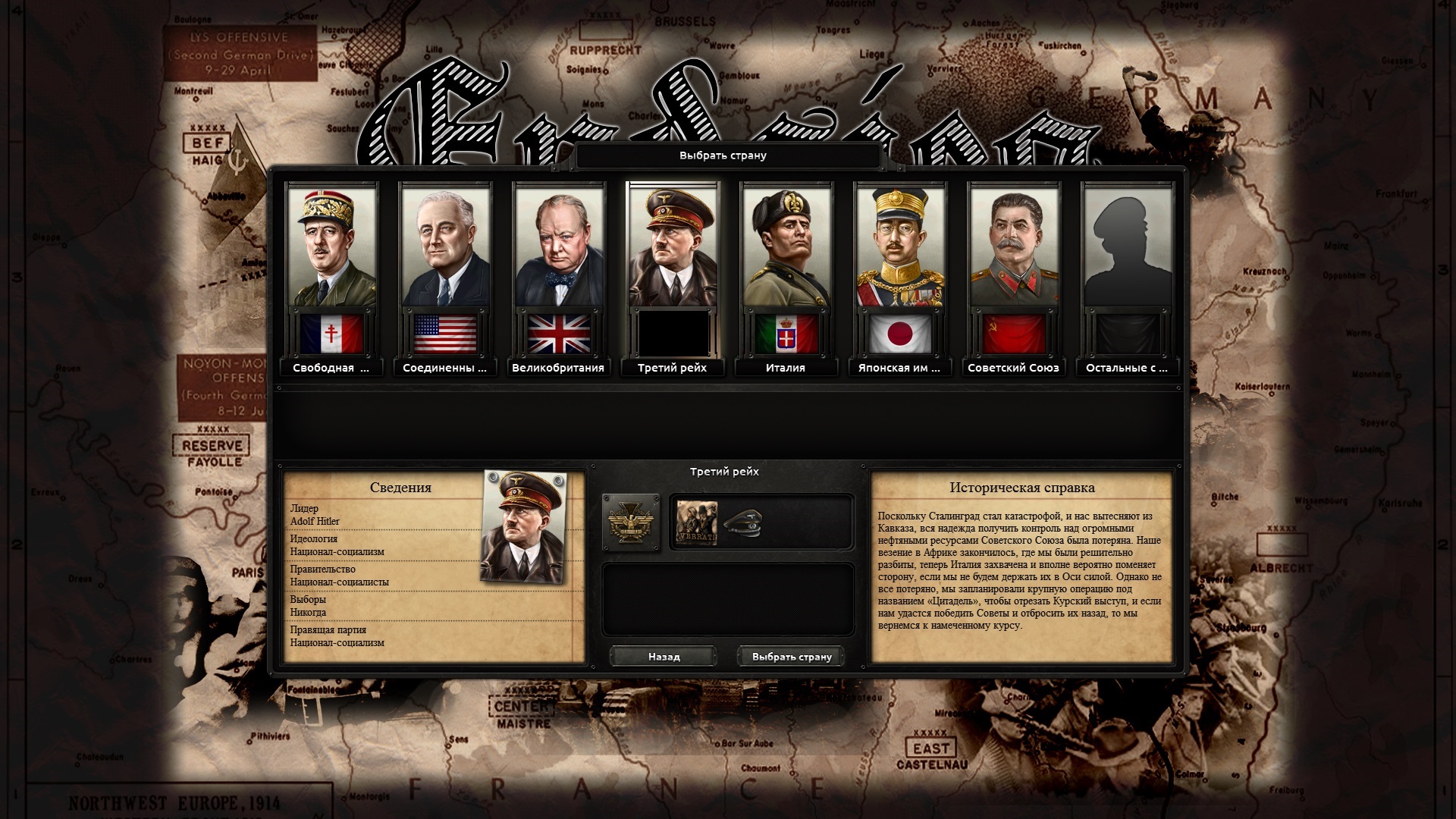 Этот уникальный мод охватывает события сразу двух мировых войн. Примите участие в Великой Отечественной войне. Спасите Рейх от поражения или помогите Советскому Союзу одержать верх. Вы также можете взять брозды правления одной из ключевых держав в Великой войне и привести свой союз к победе.