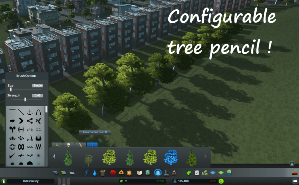 Позволяет размещать природные ресурсы в игре + предоставляет настраиваемую кисть для редактора ландшафта и воды. Мод предоставляет некоторые инструменты редактора карт в игре (например, инструмент ресурсов). Этот мод также имеет собственную кисть деревьев, которую можно настроить с помощью панели инструментов «Brush Options». Можно настроить плотность посадки дерева («Сила»), а также размер и форму кисти. Чтобы использовать режим карандаша дерева, удерживайте нажатой левую кнопку мыши и двигайте мышь в режиме одного дерева.