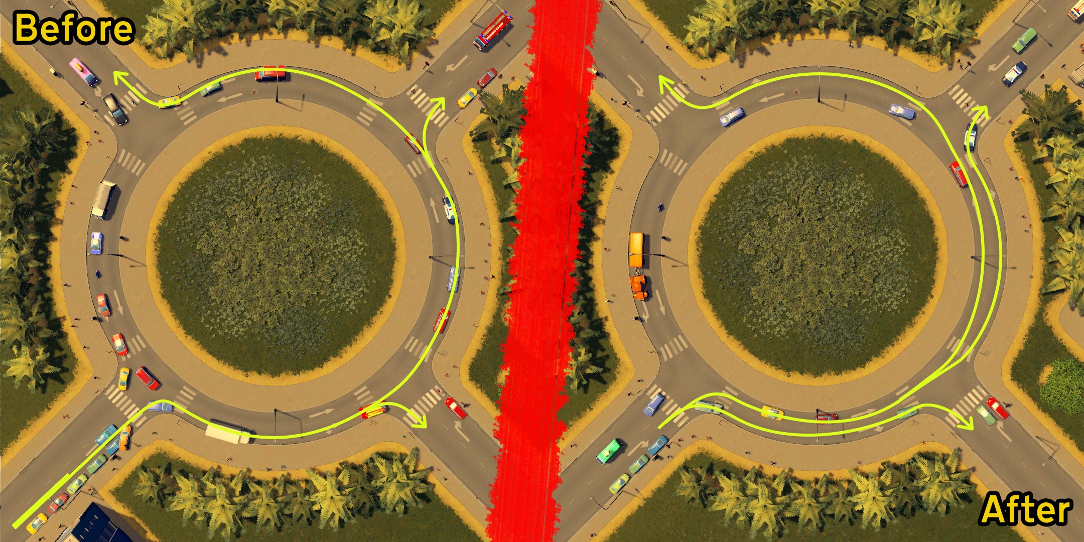 Мод переопределяет правила соединения полос движения по умолчанию для всех дорожных развязок. Он способствует созданию выделенных поворотных полос и более сбалансированному распределению соединений полос движения в каждом направлении, что способствует лучшему использованию полос движения транспортными средствами. Есть две ситуации, в частности, когда он работает лучше, чем поведение игры по умолчанию: